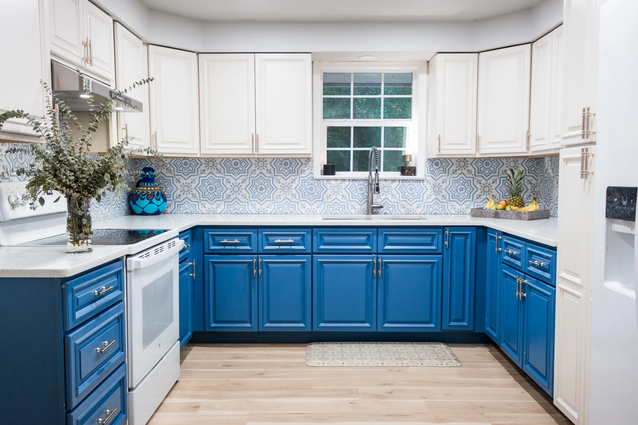 In this ranch home, the kitchen was thoughtfully refreshed to bring light, culture, and connection into a compact footprint. Because the home offers limited natural light, the design centered around a blue and off white color palette — a combination that reflects clarity and openness, while visually expanding the space.